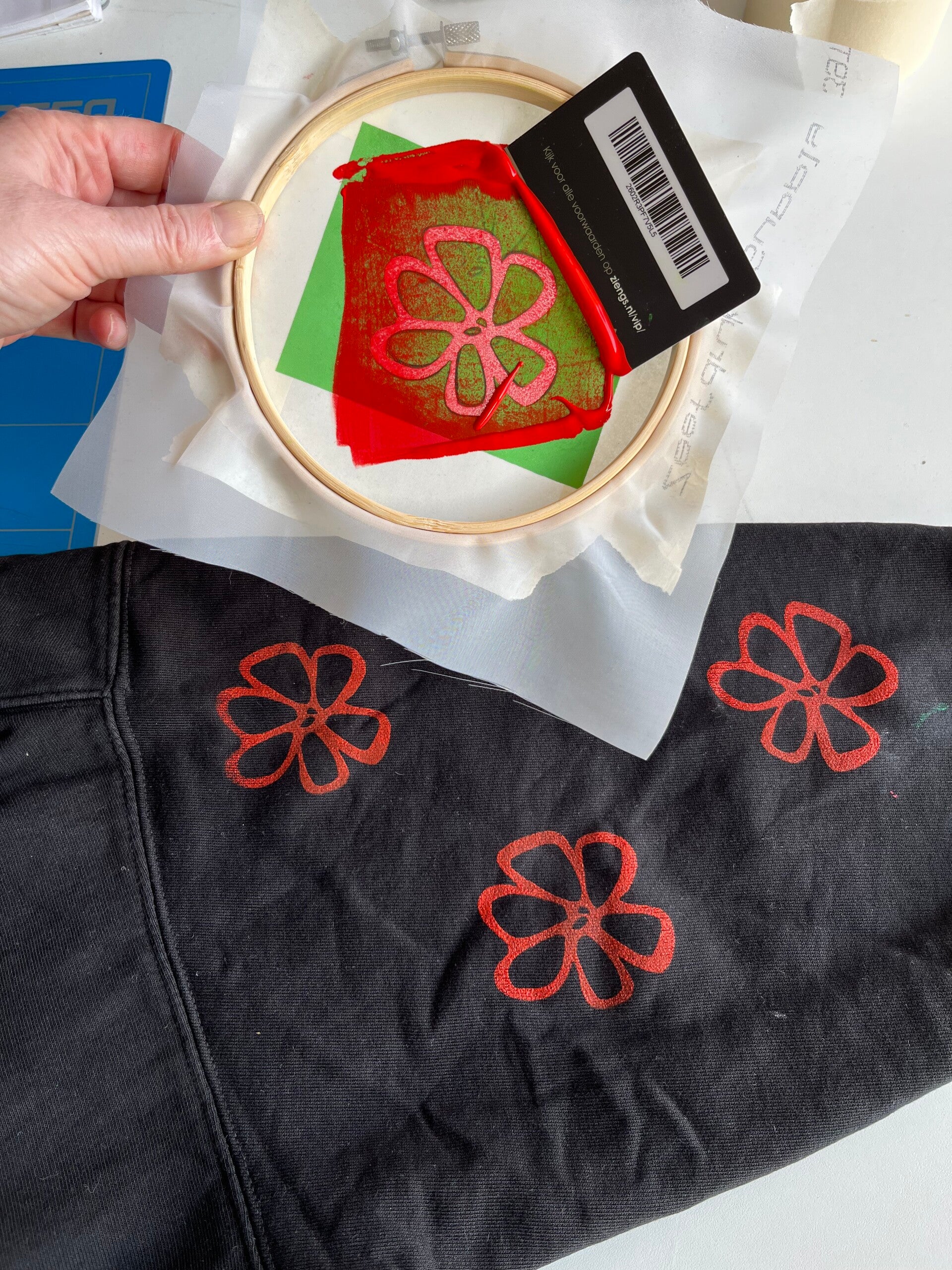 Deze methode is zeer geschikt om op textiel te drukken. Super leuk om relatief snel een persoonlijke touch te geven aan bijvoorbeeld kledingstukken of stoffen tasjes.